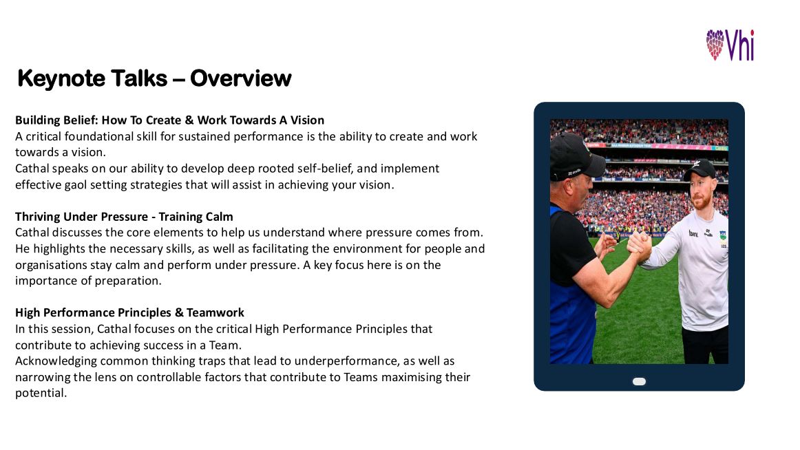 Vhi Home Fitness Mental Wellbeing Body Health Additional Nutrition Holistic Solutions Parent Support Speakers Vhi Speakers Health and Wellbeing Services Aoife Ni Eochaidh Click to Download Book This Session Mark O'Connor Click to Download Book This Session Paul Cahill Click to Download Book This Session Johnny Holland Click to Download Book This Session Daragh Sheridan Click to Download Book This Session Dr Ciara Kelly Click to Download Book This Session Susan Kilcline Click to Download Book This Session Maureen Hoey Click to Download Book This Session Asleigh Tobin Click to Download Book This Session Tilly Stanley Click to Download Book This Session Lauren Tinkler Click to Download Book This Session Brian Samson Click to Download Book This Session Darren Reilly Click to Download Book This Session Richard Hogan Click to Download Book This Session Sile Seoige Click to Download Book This Session Martha Donnelly Click to Download Book This Session Marie Gleeson Click to Download Book This Session Brian Cashman Click to Download Book This Session Aidan McCullen Click to Download Book This Session Alan P.C Kenna Click to Download Book This Session Miriam Hussey Click to Download Book This Session Robbie Smyth Click to Download Book This Session Rebecca Molloy Click to Download Book This Session Imelda Norris Click to Download Book This Session Lisa de Jong Click to Download Book This Session Naomh McElhatton Click to Download Book This Session Claire O'Connor Click to Download Book This Session Fiona Doyle Click to Download Book This Session Andy Dunne Click to Download Book This Session Damian Browne Click to Download Book This Session John McKeown Click to Download Book This Session Brian Cody Click to Download Book This Session Nina Carberry Click to Download Book This Session Enda O'Doherty Click to Download Book This Session Aoife McGrath Click to Download Book This Session Doctor Maire Treasa Ni Cheallaigh Click to Download Book This Session Cathal Sheridan Click to Download Book This Session Brent Pope Click to Download Book This Session Claire Walsh Click to Download Book This Session Colman Power Click to Download Book This Session Daragh Fleming Click to Download Book This Session Joanne O’Riordan Click to Download Book This Session Susan O’Brien Click to Download Book This Session Felix Jones Click to Download Book This Session Sine Dunne Click to Download Book This Session Keith Barry Click to Download Book This Session Niall Ronan Click to Download Book This Session Pamela Remwick Click to Download Book This Session Paul Merriman Click to Download Book This Session David Roche Click to Download Book This Session Rachel Gotto Click to Download Book This Session Dr Janine van Someren Click to Download Book This Session Catherine Sheridan Click to Download Book This Session Sinead McKiernan Click to Download Book This Session Susan Dwyer Click to Download Book This Session Colm Ward Click to Download Book This Session Lucy Gernon Click to Download Book This Session Danica Murphy Click to Download Book This Session Gina London Click to Download Book This Session Treasa Hanniffy Click to Download Book This Session Padraig O’Hora Click to Download Book This Session Sinead Kennedy Click to Download Book This Session Davy Fitzgerald Click to Download Book This Session Joe Canning Click to Download Book This Session Peter Ryan Click to Download Book This Session Conor Buckley Click to Download Book This Session Hannah Tyrrell Click to Download Book This Session Guilherme Souza Click to Download Book This Session